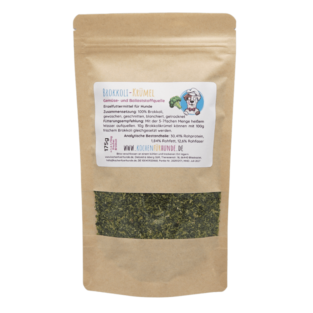 Wenn du also normalerweise z.B. 130g Gemüse fütterst, kannst du die Menge einfach durch 8 oder 10 teilen, um auf das Rohgewicht der Brokkolikrümel zu kommen und z.B. etwa 15g einweichen und dann füttern. Natürlich muss das keine exakte Wissenschaft sein und du kannst das großzügig aufrunden. Wir bieten Brokkoli – wie auch unseren Grünkohlbrei – bewusst in kleineren Packungen an, da die Kohlsorten oft ja nur in kleinerer Menge im Napf landen.