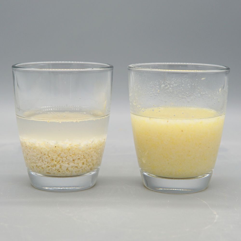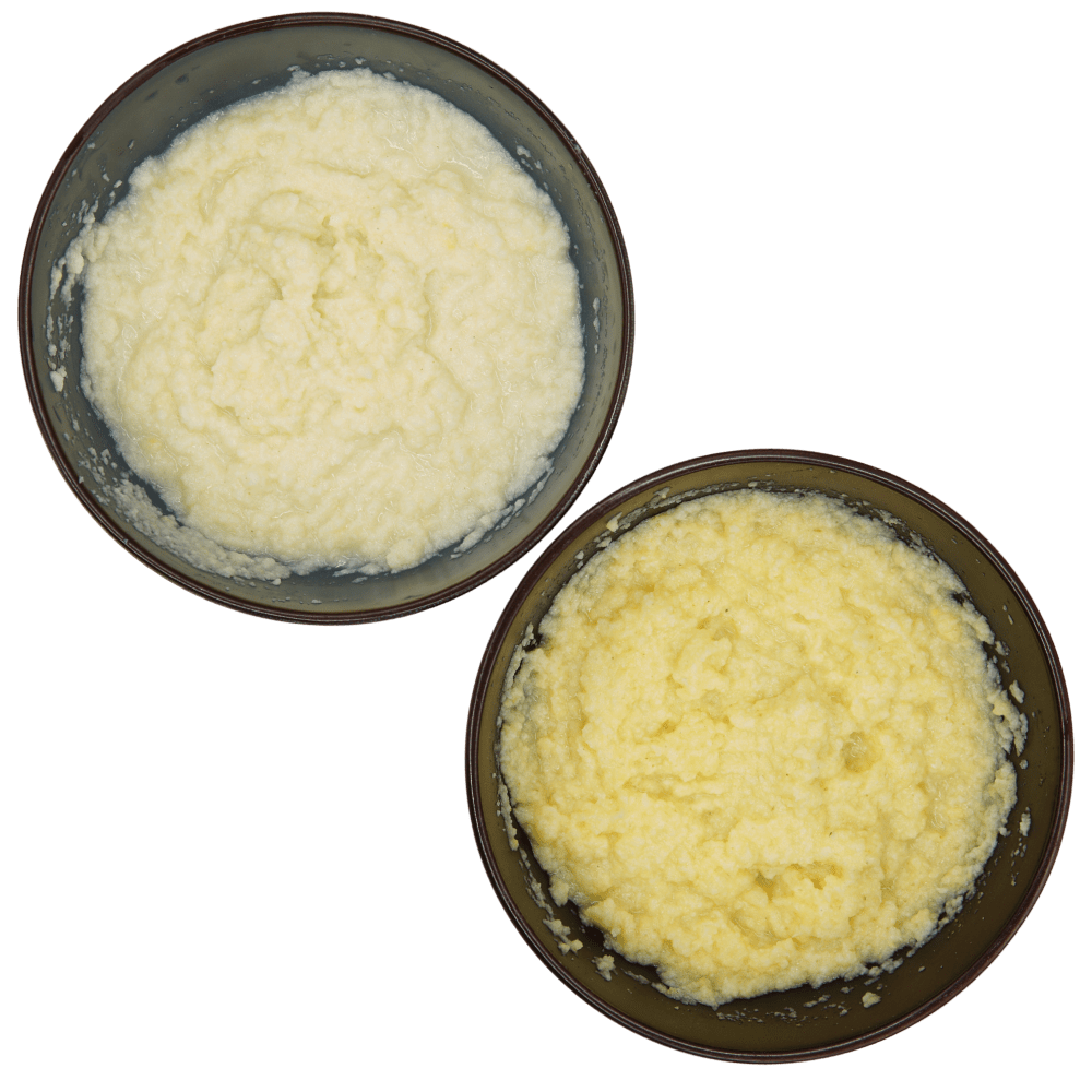 Da die Hirse gut aufgeschlossen (also extrudiert/vorgekocht) ist, kann der Brei Wasser besser als gewöhnliche Hirse binden bzw. so gut wie Congee. Um den Wassergehalt von normaler Hirse zu erhalten, wird ein Teil Hirse mit 2-3 Teilen Wasser vermengt, was aber bei unserem Hirsebrei zu einem festen Brei führt. Mit ausreichend Wasser (4-8fache Wassermenge) wird die Hirse zu einem Hirsebrei, den du ggf. von Babybrei kennst. Im zweiten Bild siehst du z.B. die 6fache Wassermenge.