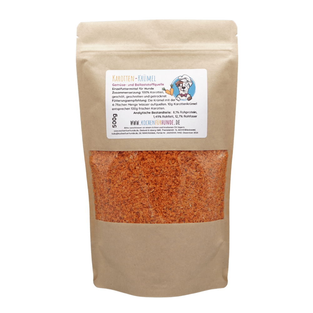 Wir empfehlen etwa die 4-7fache Menge Wasser dazuzugeben (heißes Wasser) und die Krümel kurz quellen zu lassen. Da die Stücke so klein sind, ist es dann wie grob pürierte bzw. geraspelte Karotten, was die meisten Hunde problemlos vertragen (siehe Bild). Auch kannst du die Karottenkrümel einfach mit dem Fleisch zusammen kochen, denn anders als große frische Karottenstücke werden die kleinen Krümel schneller gar. Bei sehr empfindlichen Hunden können die Krümel auch stärker gekocht oder püriert werden oder du testest mal unseren Karottenbrei, der bereits gekocht und gut aufgeschlossen ist.