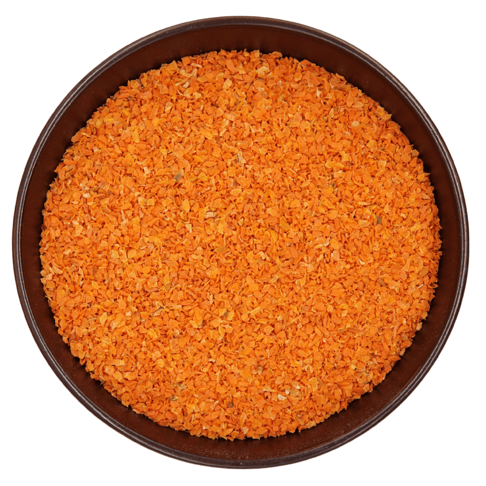 Unsere Karotten-Krümel sind echtes Feinschnitt-Karottengranulat: sorgfältig gewaschene, geputzte und geschälte, grießfein geschnittene (1-2mm) Karotten, die schonend getrocknet wurden.