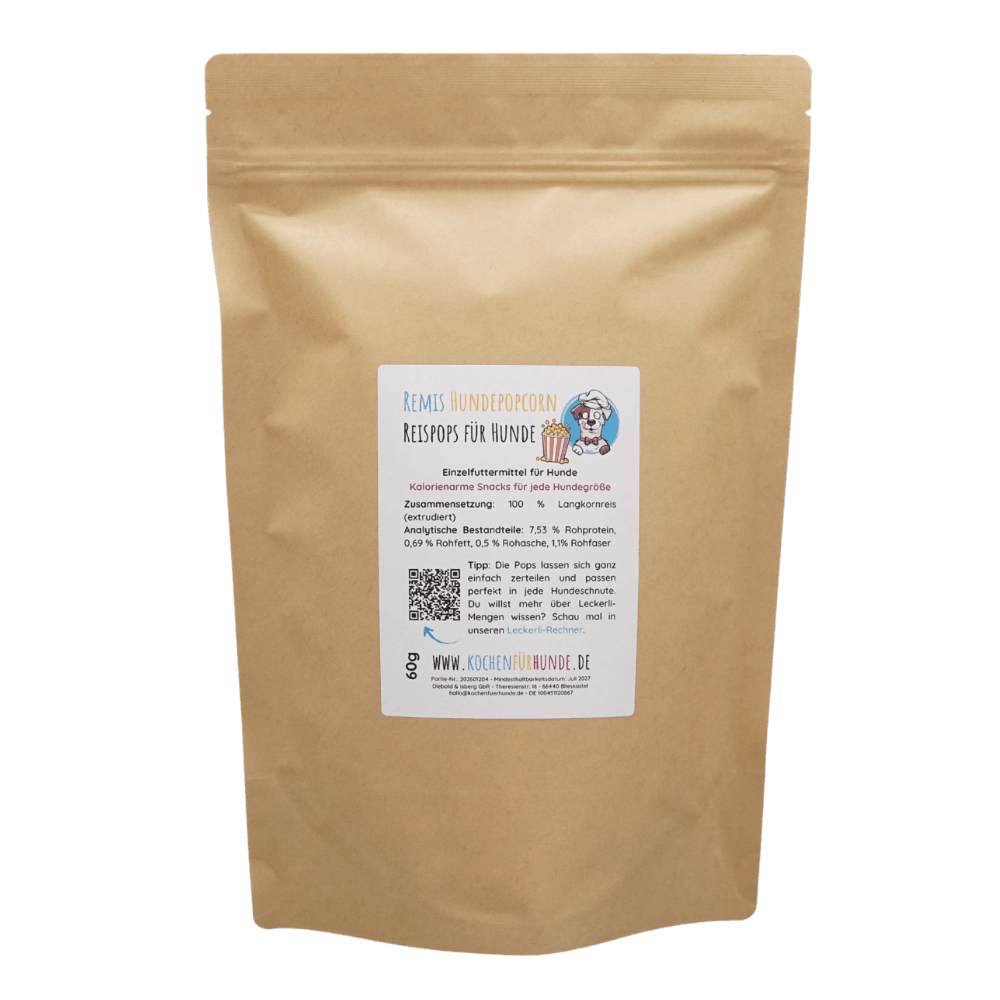 Wir empfehlen maximal 10% der täglichen Energie durch Leckerlis zuzuführen, damit die Fütterung nicht unausgewogen wird. Mit Remis kalorienarmen Popcorn kannst du viele Leckerlis geben, da sie super wenig wiegen – mit unserem Leckerli-Rechner erhältst du einen ungefähren Überblick.